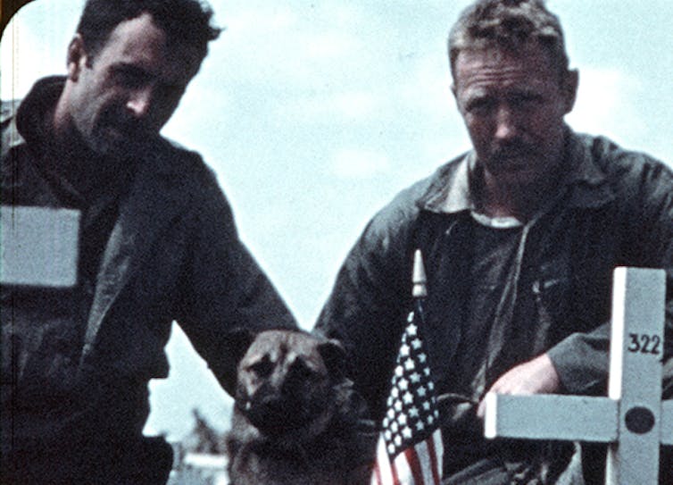 After the dedication ceremonies, Marines walked the 5th Division cemetery, looking for familiar names. The photographers were there, and one recorded the footage of the two Marines – names not known – and the dog, at a grave with only the number 322 as a visible marking.
