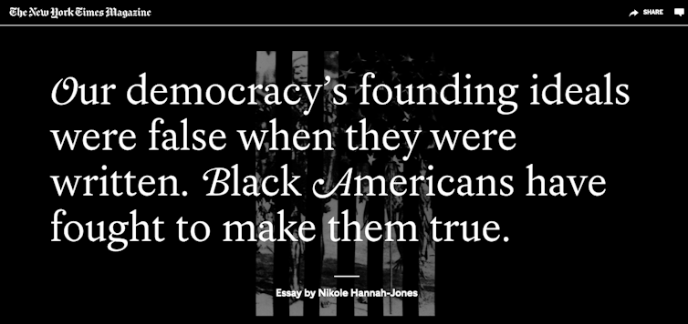 Screen Shot of the New York Times homepage for its series, “1619.” New York Times