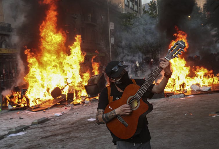Protest music in Santiago, Chile, Nov. 12, 2019. AP Photo/Esteban Felix