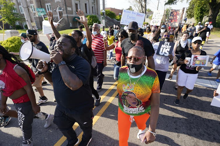 A march along historic South Road Street in Elizabeth City, North Carolina, protesting the police shooting of Andrew Brown Jr. AP Photo/Steve Helber
