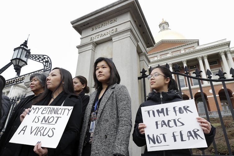 Members of the Massachusetts Asian American Commission protest on the steps of the Statehouse in Boston. AP Photo/Steven Senne