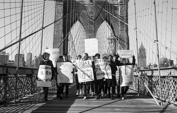 School boycott picketers march across the Brooklyn Bridge to the Board of Education in 1964. Bettmann Archive/Getty Images