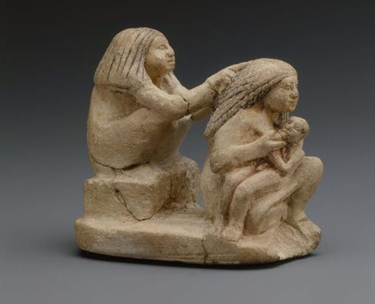 Group of two women and a child, ca. 1981-1500 BC. A woman is shown nursing her child while another woman dresses her hair. (The Metropolitan Museum of Art)