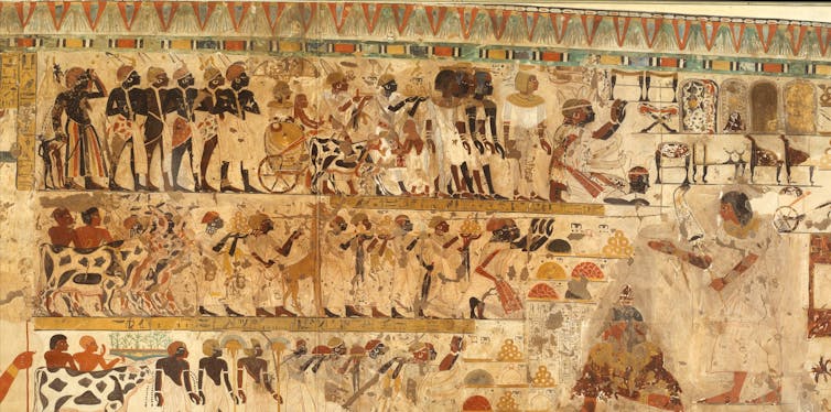 A replica of Nubian Tribute Presented to the King, Tomb of Huy, showing Nubians with their children paying tribute to the Egyptian Pharaoh. Based on the original from circa 1353–1327 B.C. (Wikimedia), CC BY-SA